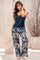 Pijama de dos piezas elaborada en satín de tacto suave, compuesta por camiseta de tiras con espalda decorada en encaje y diseño de tiras, y pantalón largo estampado de excelente caída.